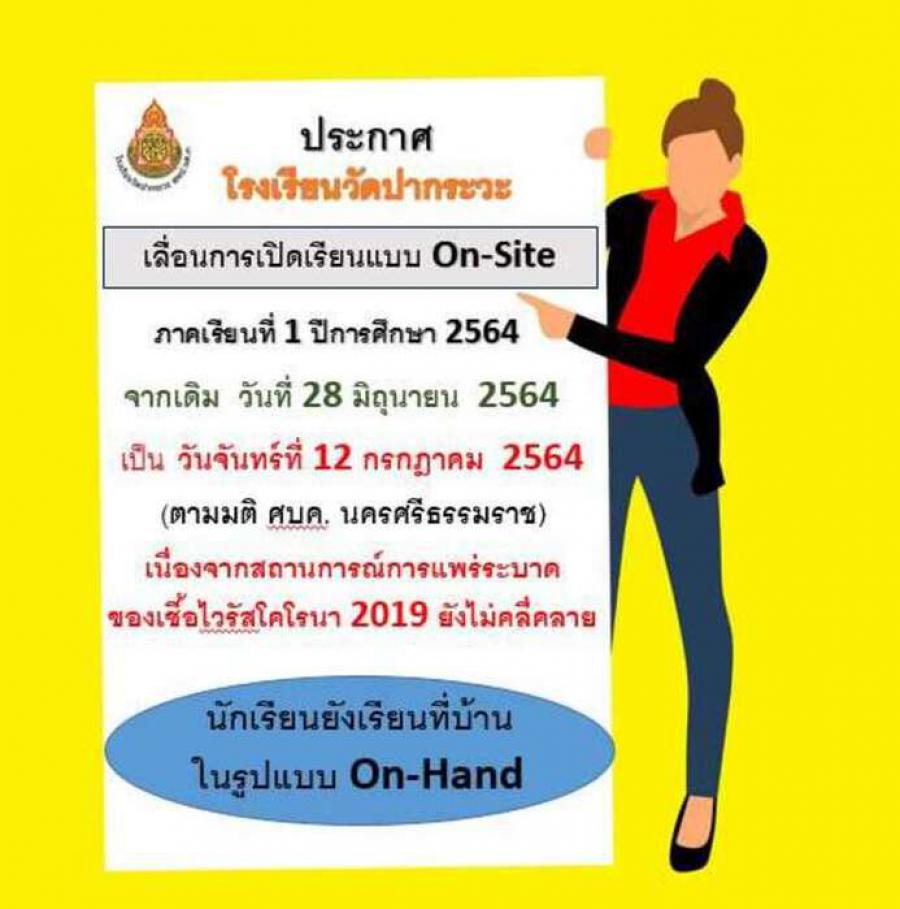 มติ ศบค.นครศรีธรรมราช วันที่ 22 มิถุนายน 2564 เห็นชอบให้เลื่อนการเปิดเรียน On-Site (การมาเรียนที่โรงเรียน) ภาคเรียนที่ 1 ปีการศึกษา 2564 เป็นครั้งที่ 2 จากเดิมให้เปิดเรียน On-Site ในวันจันทร์ที่ 28 มิถุนายน 2564 ให้เลื่อนเป็นเปิดเรียนวันจันทร์ที่ 12 กรกฎาคม 2564 เนื่องจากสถานการณ์โควิด 19 ในจังหวัดนครศรีธรรมราช ยังไม่ดีขึ้น S:0