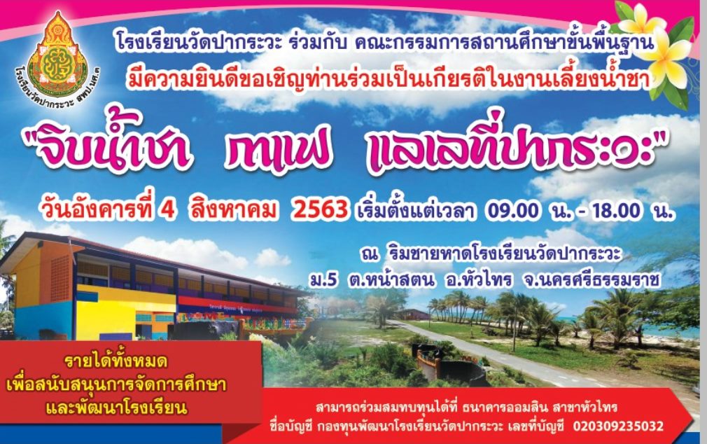 โรงเรียนวัดปากระวะ ขอเรียนเชิญท่านผู้มีเกียรติ ศิษย์เก่าและผู้มีจิตศรัทธาทุกท่านร่วมงาน "จิบน้ำชา กาแฟ แลเลที่ปากระวะ"