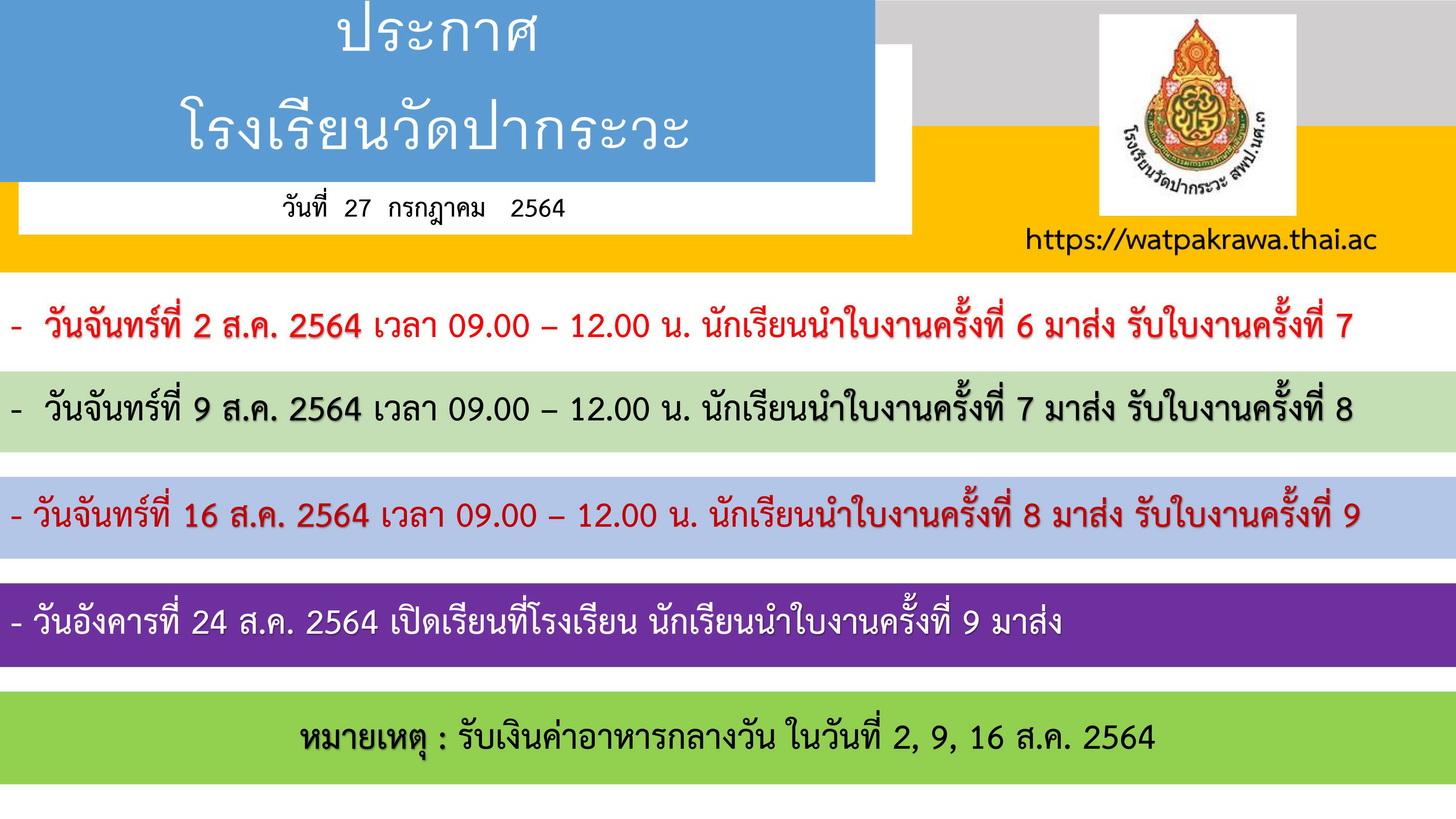 #โรงเรียนวัดปากระวะ จึงขอแจ้งให้นักเรียนเรียน On-Hand ที่บ้านไปจนถึงวันอังคารที่ 24 สิงหาคม 2564
