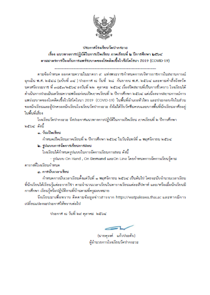 ตามคำสั่งจังหวัดนครศรีธรรมราช ที่ ๓๘๕๓/๒๕๖๔ ลงวันที่ ๒๒ ตุลาคม ๒๕๖๔ เรื่องปิดสถานที่เป็นการชั่วคราวเนื่องจากสถานการณ์การแพร่ระบาดของโรคติดเชื้อไวรัสโคโรนา 2019 (COVID-19) และในพื้นที่อำเภอหัวไทร สถานการณ์การแพร่ระบาดของโรคติดเชื้อไวรัสโคโรนา 2019 ยังไม่ดีขึ้น ประกอบกับในส่วนของนักเรียนและผู้ปกครองนักเรียนโรงเรียนวัดปากระวะ ยังไม่ได้รับวัคซีนครบและบางพื้นที่นักเรียนอาศัยอยู่ในพื้นที่เสี่ยง โรงเรียนจึงยังไม่สามารถเปิดเรียน On Site โดยให้นักเรียนมาเรียนที่โรงเรียนได้ตามปกติ โรงเรียนจึงขอแจ้งแนวทางการปฏิบัติในการเปิดเรียน ภาคเรียนที่ ๒ ปีการศึกษา ๒๕๖๔ ดังนี้